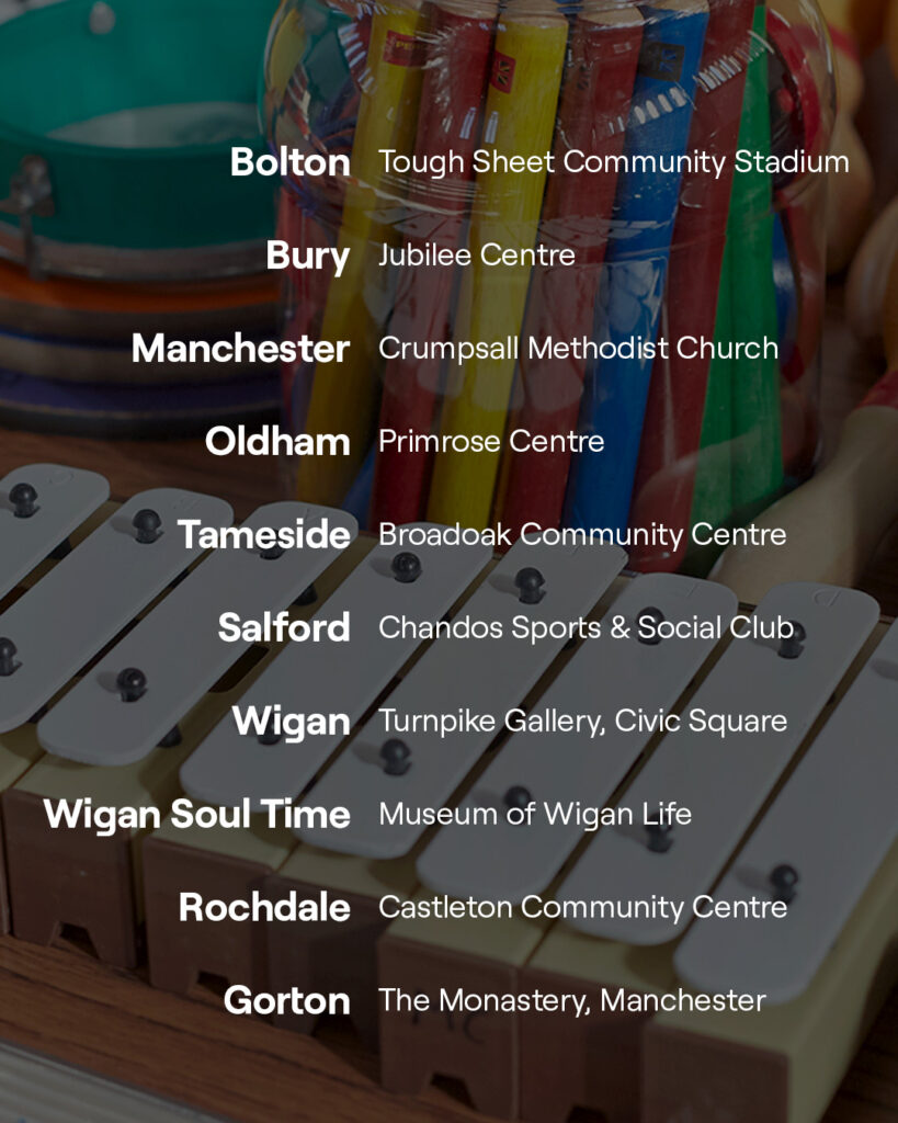 Music Cafés for people living with dementia and their carers will run weekly in community centres, church halls and dementia support groups in Bolton, Bury, Manchester, Oldham, Rochdale, Salford, Stockport, Tameside, Trafford and Wigan & Leigh. Each Music Café provides in the moment’ person-centered care for people living with dementia based upon our award winning Music in Mind techniques.