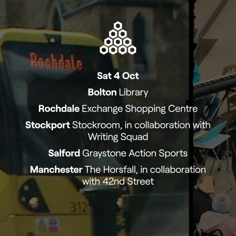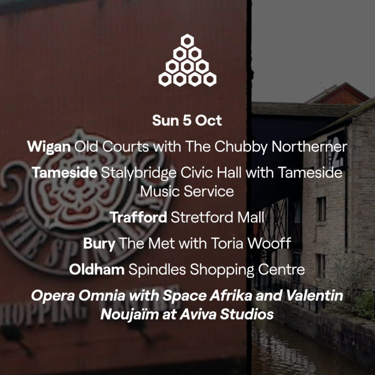 From 1–5 October, we’ll be performing for free across all ten boroughs of Greater Manchester. From skate parks to shopping malls, libraries and more, we’re taking music into unexpected places—meeting people where they are and finding out what YOU want from our organisation. (Full list of activities lower down)