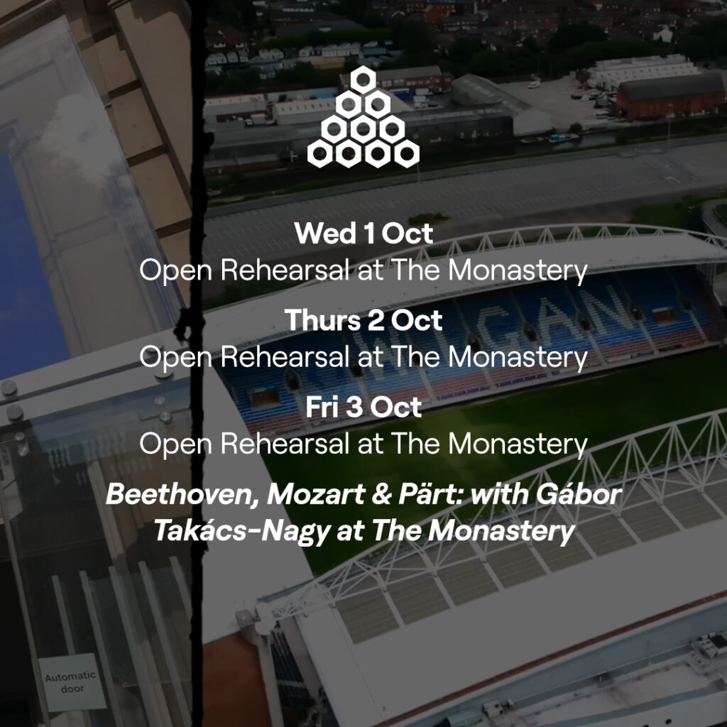 In addition to our free events, the weekend will feature two special ticketed headline performances by our orchestra. At our home, The Monastery in Gorton, join us for an unforgettable evening with Music Director Gábor Takács-Nagy conducting works by Mozart, Beethoven, and Arvo Pärt (click here for tickets). At Aviva Studios, experience the UK premiere of Opera Omnia, a powerful short film by critically acclaimed electronic duo Space Afrika, performed live with our musicians (click here for tickets).