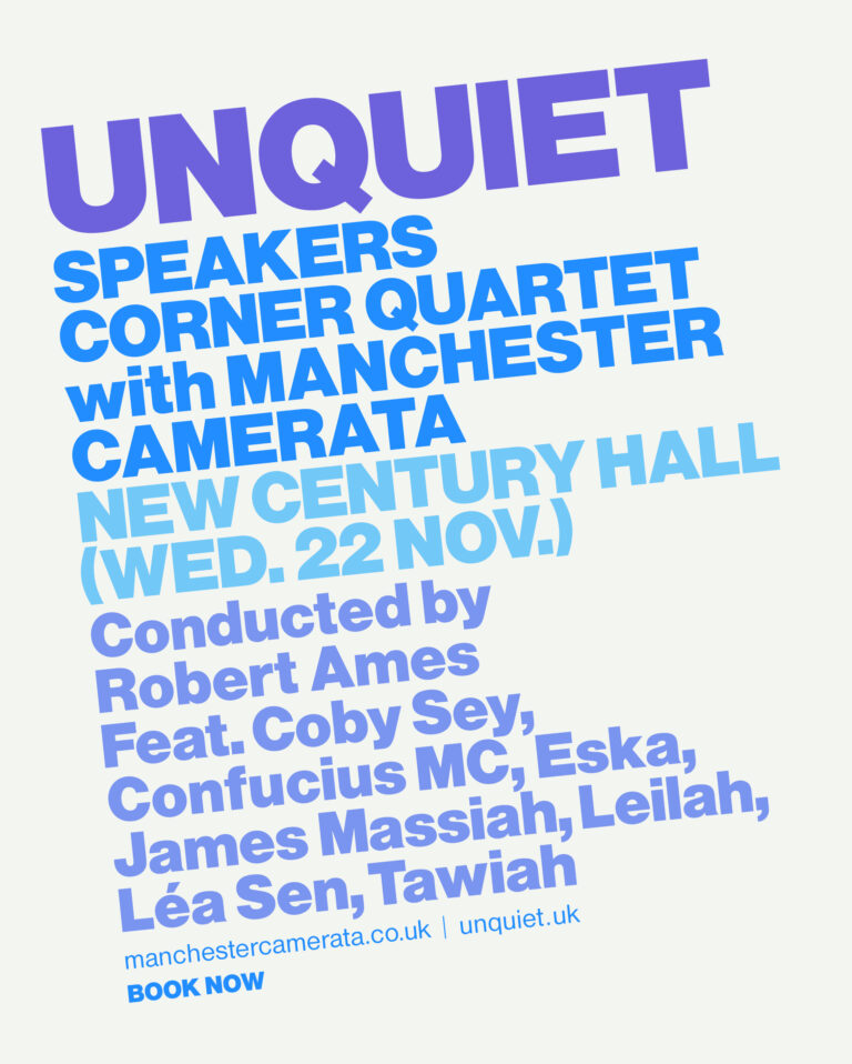 For this edition of Unquiet, we present the world’s first Speakers Corner Quartet orchestral show. Joining them will be Coby Sey, Confucius MC, James Massiah, Lea Sen, Leilah, Tawiah and Eska performing pieces from their critically acclaimed album Further Out Than The Edge and more.